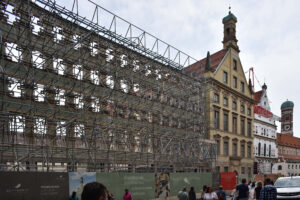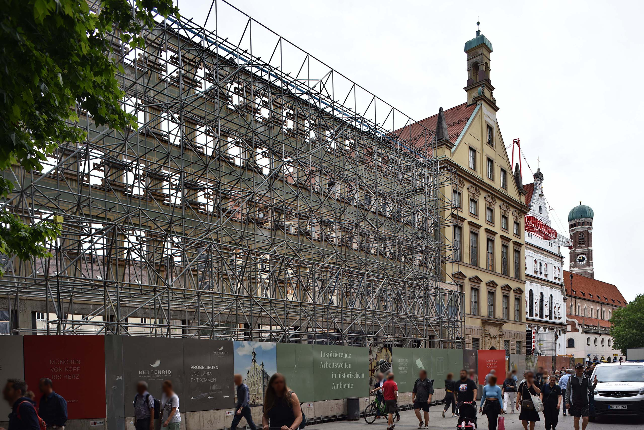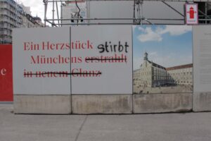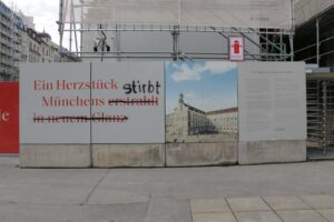 Die Architekten des Umbaus, das Büro Morger Partner aus Basel, wollten die Arkade zur Neuhauser Straße zunächst von acht auf fünf Meter verschmälern. Signa wollte aber noch mehr Fläche für den Innenraum. Die CSU-SPD-Mehrheit im Stadtrat beschloss dann die komplette Schließung der Arkade an der Kapellenstraße und die Verschmälerung der Arkade an der Neuhauser Straße von acht auf 4,80 Meter. Das Münchner Forum nannte 2018 diese Entscheidung der Stadt „die endgültige Kapitulation der Stadtplanung vor einem Investment-Klüngel“.4 – „Die Pläne des Investors, die Arkaden an der Neuhauser Straße zu verschmälern und an der Kapellenstraße zu entfernen, denen der Stadtrat zwischenzeitlich zugestimmt hatte, stießen auf breite Kritik. Das Münchner Forum und die Stadtgestaltungskommission forderten, die Arkaden zugunsten des öffentlichen Raums in der bisherigen Form zu erhalten. Der im Februar 2020 durch den Stadtrat beschlossene Bebauungsplan griff die Kritik auf und legte entgegen vorheriger Planung die Beibehaltung aller drei Arkaden verbindlich fest.“ (Wikipedia)