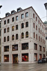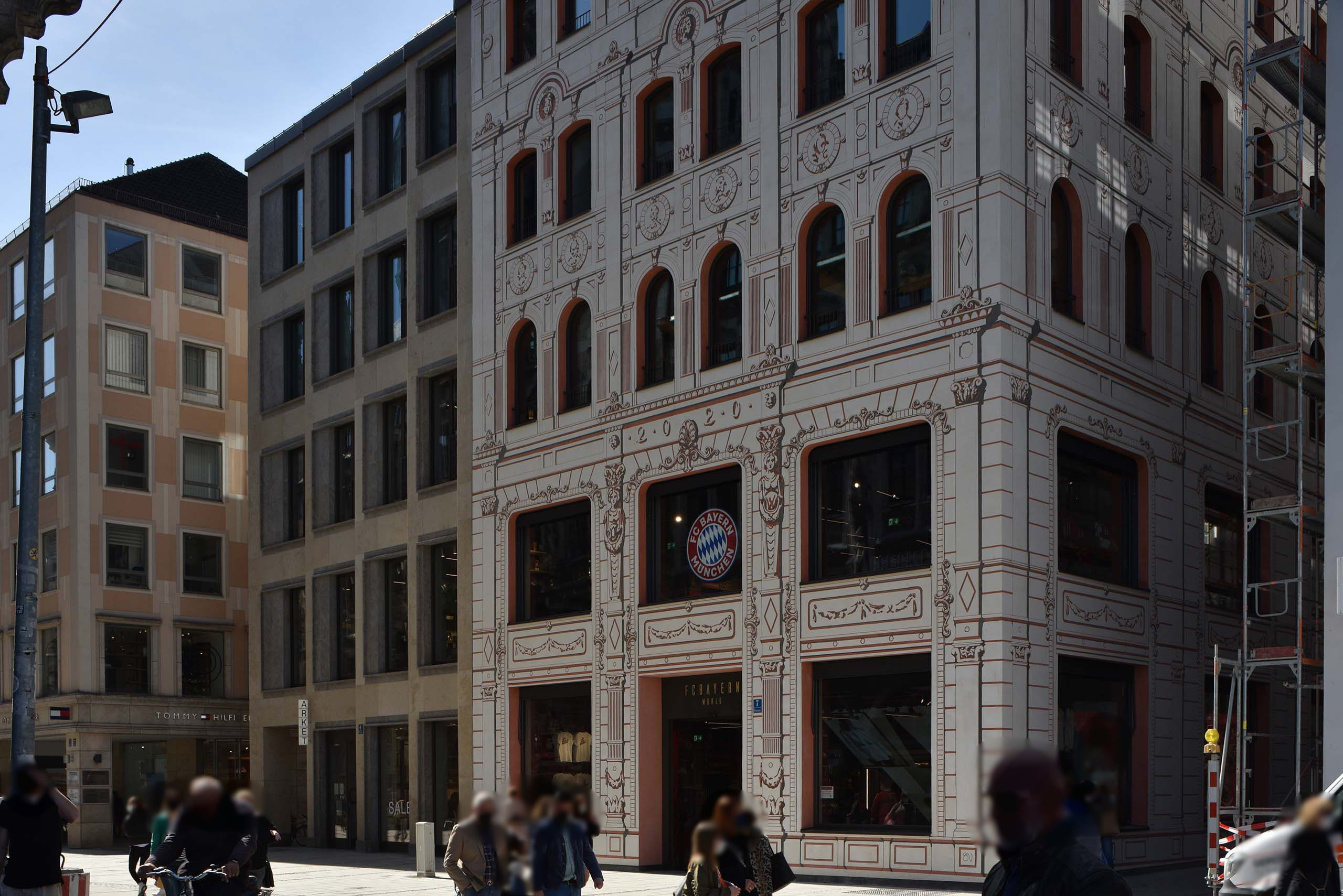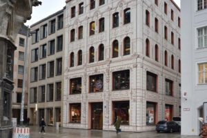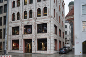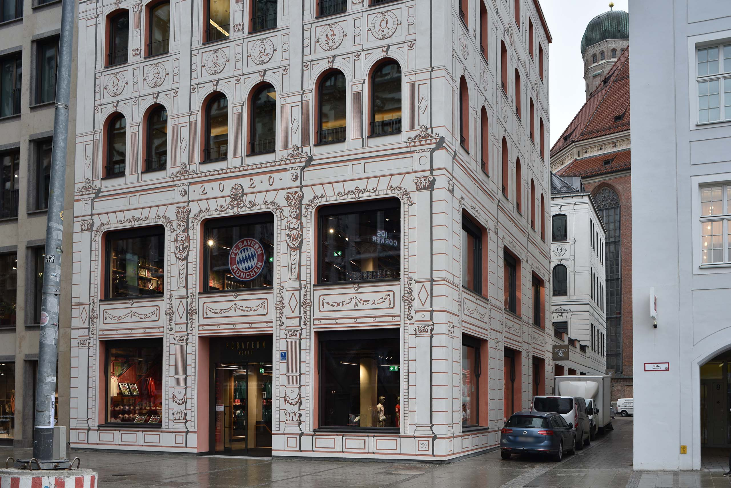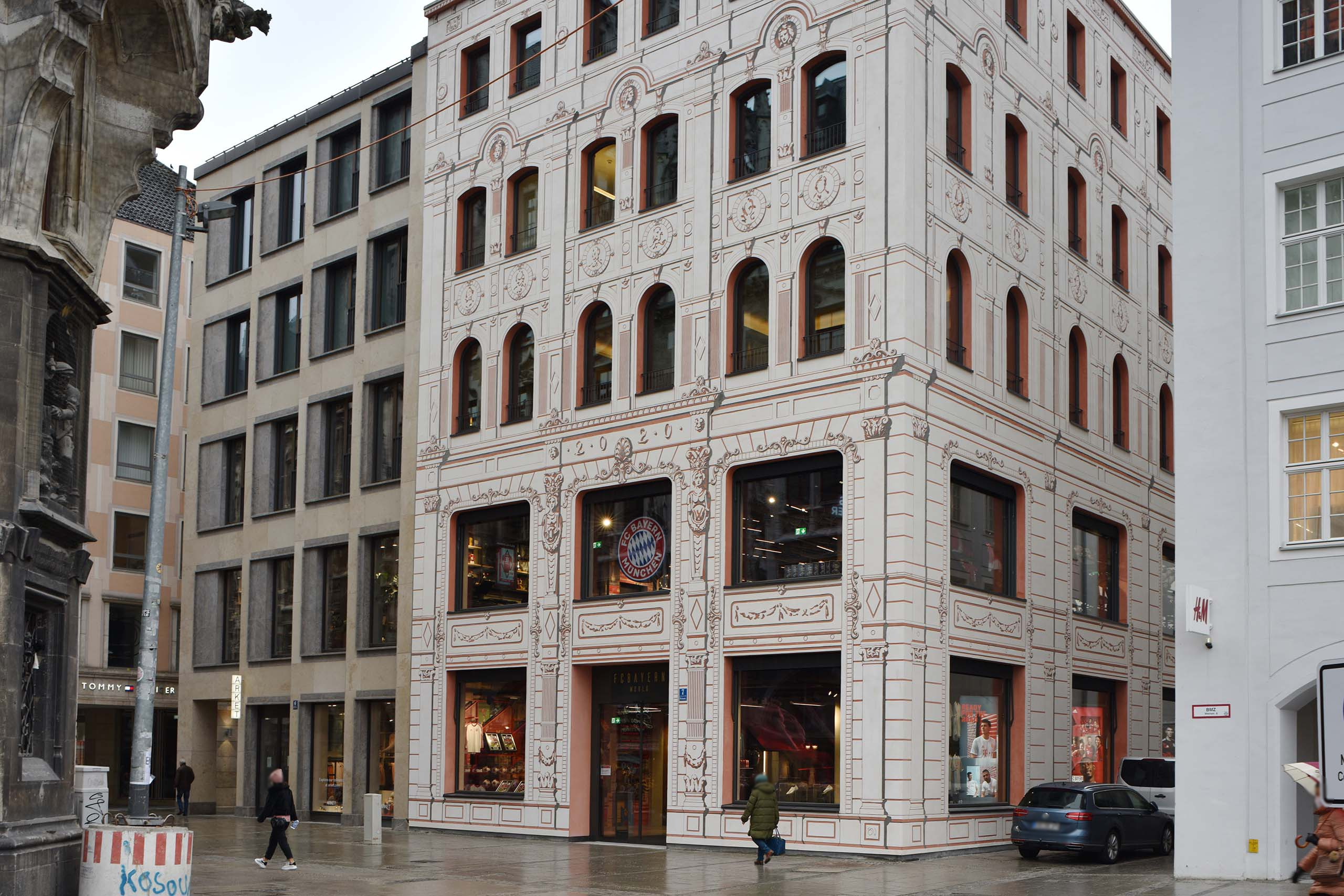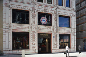 Der Architekturkritiker der SZ war begeistert. Das ursprüngliche Haus an der Weinstraße 7 stammte aus dem Jahr 1872 und wurde für die FC Bayern Welt abgerissen. Das Architekturbüro des Neubaus ist Hild und K Architekten. Prof. Andreas Hild zitiert das FC Bayern-Rot mit einem roten Eisenoxid, das FCB-Schwarz mit einer Rußform und das FCB-Weiß mit Kalk. „Die Stadt wird mit diesem Haus beschenkt. München ist hier, in seinem Zentrum, wieder richtig münchnerisch.“3