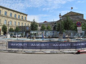IAA noch „erfolgreicher“? 2021 kamen 744 Aussteller und etwa 400.000 Besucher aus 95 Ländern zur IAA Mobility nach München. Zur Erinnerung: Es gab Demonstrationen, Autobahnblockaden, ein Protestcamp von „Sand im Getriebe“, Kritik an der Übernahme der Münchner Innenstadt durch die Autoindustrie und die Kritik am „Greenwashing“ der IAA. 2023 soll die Veranstaltung vom 5. bis 10.9. laut Hildegard Müller, der VDA-Präsidenten, noch erfolgreicher werden. Die öffentlichen Plätze wie Marienplatz, Königsplatz, Ludwigstraße etc. werden auch 2003 durch die Autoindustrie belegt. Nur der Odeonsplatz soll verschont werden: Hier sollen die Besucher sich entspannen.66