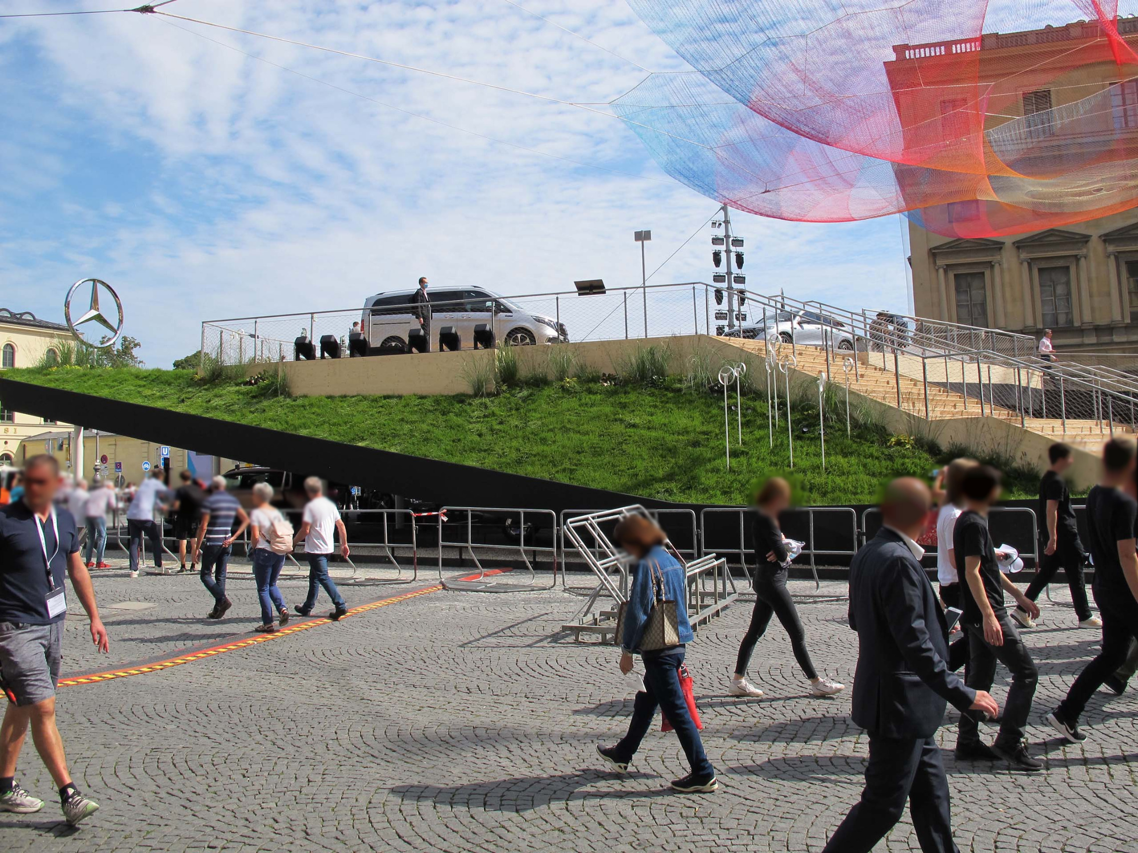 IAA Mobility durchpflügt den Königsplatz. Im Vorfeld der IAA Mobility war der Rasen auf dem Königsplatz in bestem Zustand. Der Boden hinter der Glyptothek war frisch eingesät worden. Nach der IAA waren dort bis zu 60 Zentimeter tiefe Furchen von Transportfahrzeugen. Insgesamt müssen etwa 8000 qm Rollrasen auf Kosten des VDA neu verlegt werden. Wirtschaftsreferent Clemens Baumgärtner (CSU) hatte im Frühjahr die pflegliche Behandlung des denkmalgeschützten Königsplatzes als „Selbstverständlichkeit“ versprochen. Auch die zugesagte Durchlässigkeit war nicht gegeben: Radfahrer durften nicht passieren, Fußgänger wurden vom (Ticket-pflichtigen) Platz entfernt.36