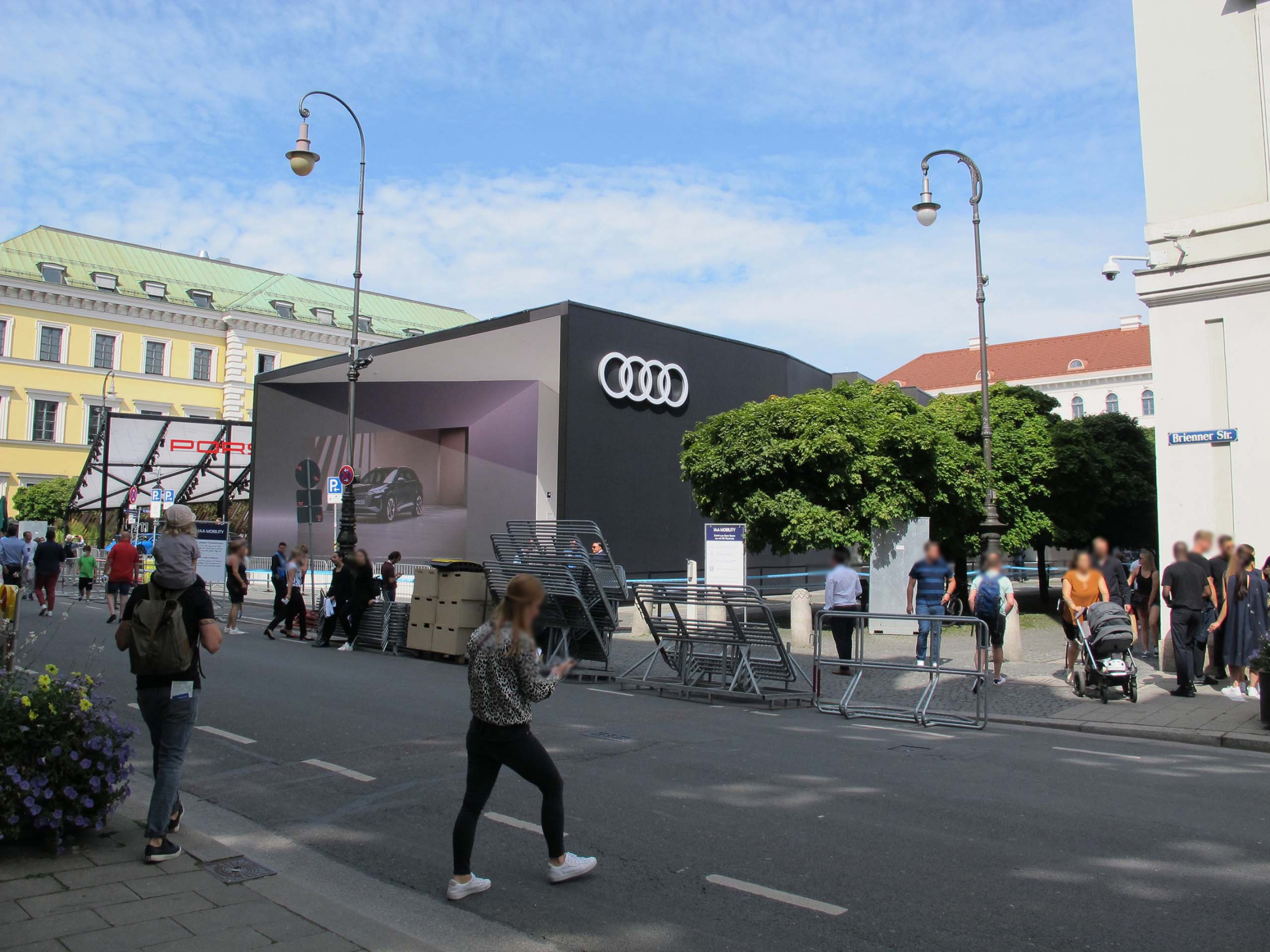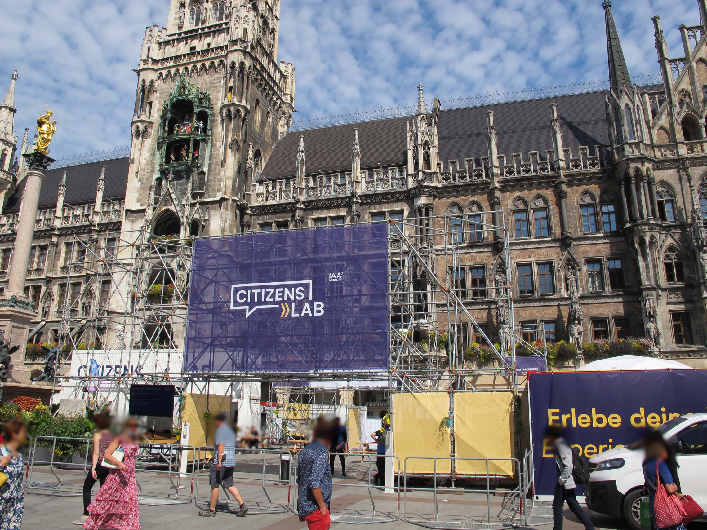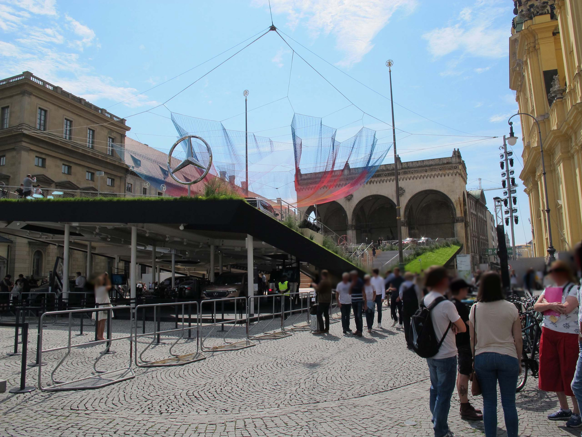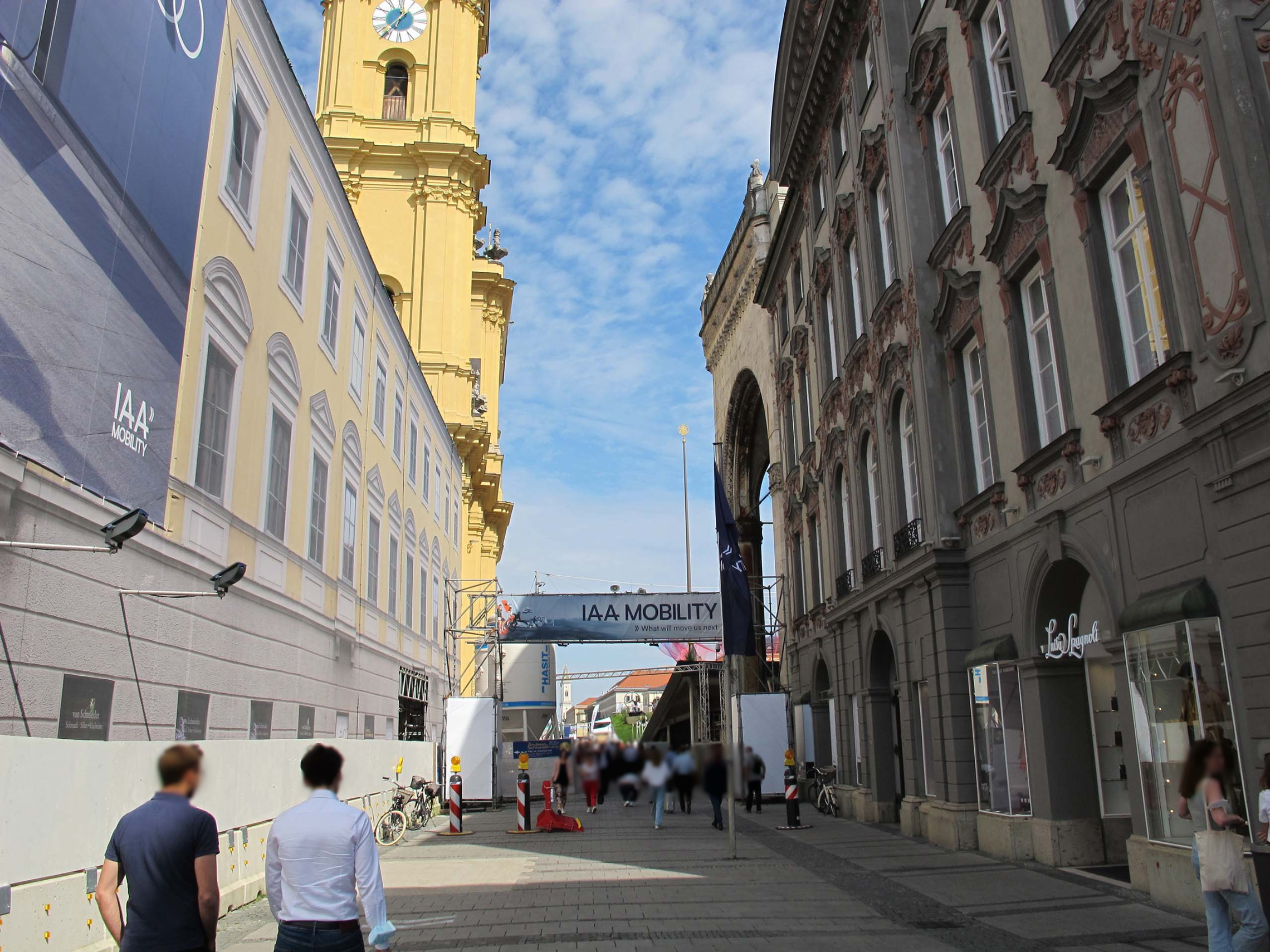 Trojanisches IAA-Pferd. Der Geschäftsführer des VDA, Jürgen Mindel, äußerte auf der Pressekonferenz zur IAA Mobility 2023, die IAA sei seit 2021 keine reine Automesse mehr. Man wolle Zukunftsfähigkeit und Nachhaltigkeit betonen und ein neues „Ökosystem der Mobilität“ schaffen. Der Platz vor der Feldherrnhalle wird diesmal nicht wie 2021 von Mercedes besetzt, sondern bleibt frei: Dafür darf der VDA die Ludwigstraße vom Odeonsplatz bis zur Schellingstraße belegen. Deshalb gibt es auf der Ludwigstraße vom 30.8. bis 14.9.2023 Verkehrsbehinderungen. Die „Blue Lane“ vom Messegelände bis zum Königsplatz entfällt. Auf dem Königsplatz gibt es kostenlose Konzerte für das Publikum, auf dem Marienplatz dürfen Bürgerinnen und Bürger bei einem „Citizen Lab“ mitmachen. Laut Messe München wurde der „Mitmachfaktor maximal hochgeschraubt“.67