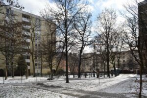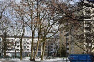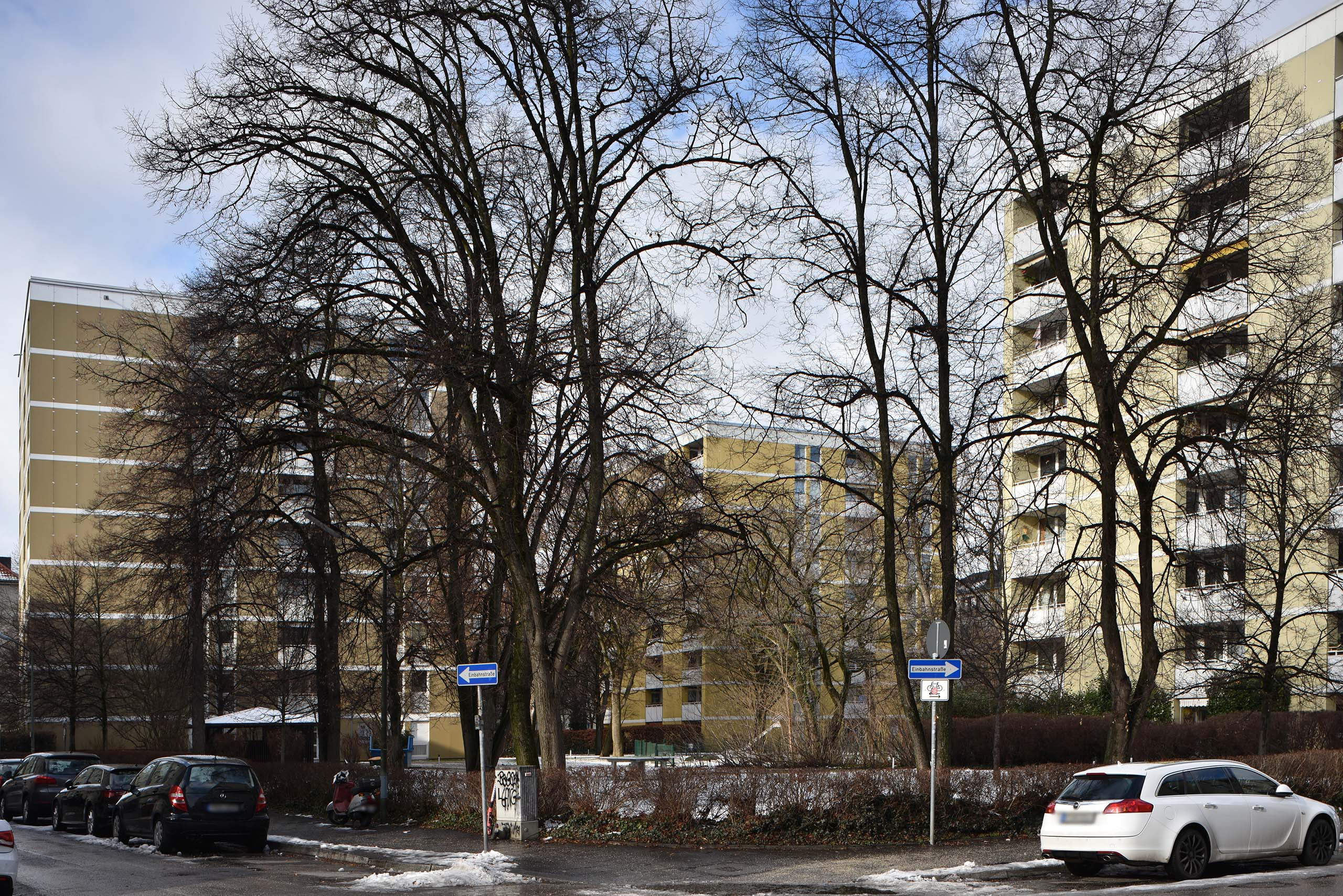Die Bayern Versicherung sprach: Es werde dunkel. Im Karree mit drei Punkthäusern mit neun Geschossen und einem Wohngebäude mit fünf Geschossen gibt es 164 Wohnungen. Die Bayern Versicherung Lebensversicherung AG hat kürzlich einen Antrag auf Vorbescheid bei der LBK eingereicht. Zwei sechsgeschossige Neubauten sollen im Innenhof errichtet werden: Da der BA Schwabing West protestiert hatte, sind es statt 100 Wohnungen etwas über 50. die Kita entfiel, hinzu soll eine neue Tiefgarage kommen. Eine Sprecherin der Bayern Versicherung verwies auf die Reduktion der Bebauungspläne, um Grünflächen zu erhalten. 20 Bäume müssten immer noch gefällt werden, aber es gäbe Ersatzpflanzungen.4