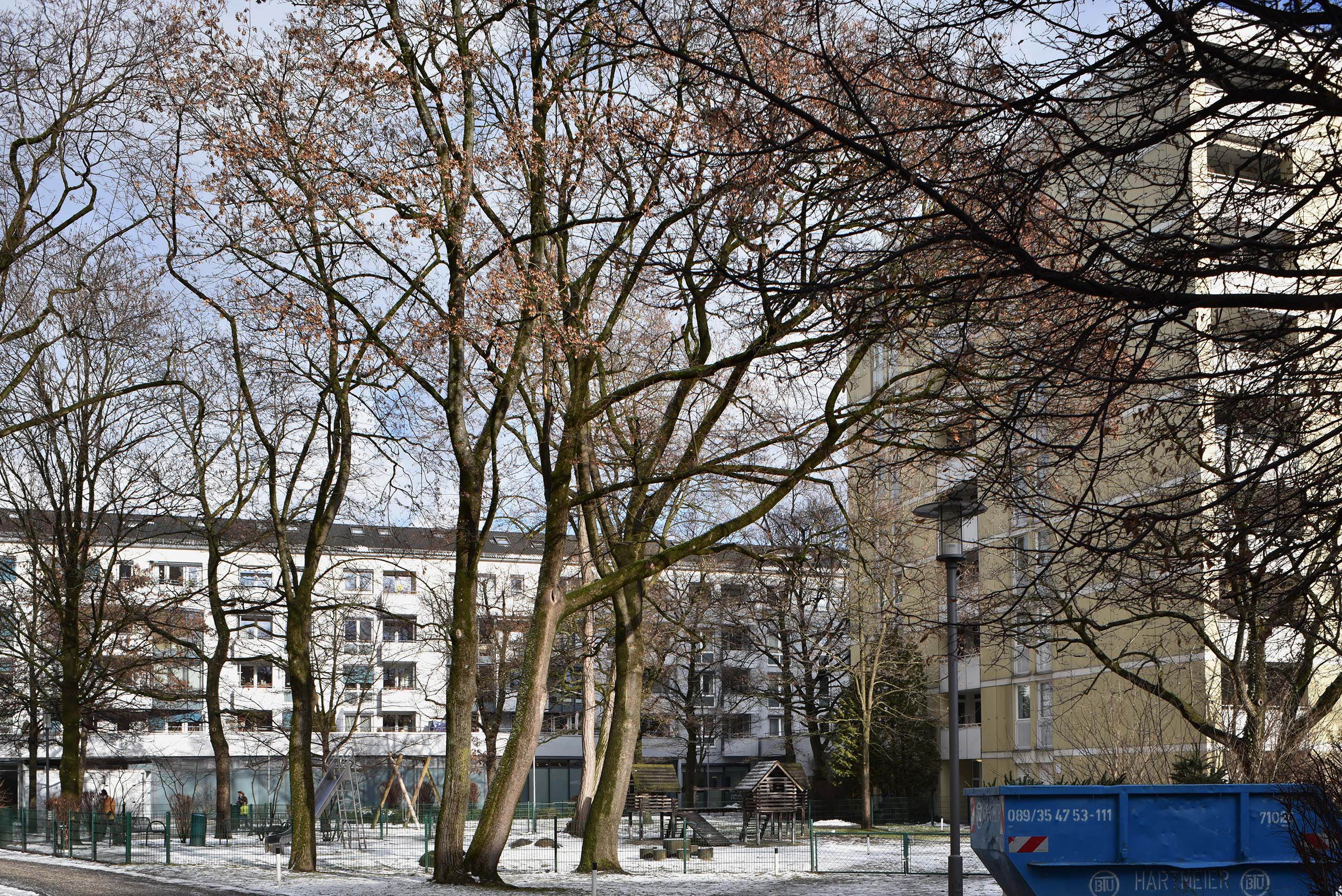 Umplanung. Die Bayern Versicherung Lebensversicherung hat nach Protesten von Mietern und des BA Schwabing-West die Nachverdichtungspläne etwas reduziert. Statt 100 Wohnungen sollen es nun 50 werden, die Kita entfällt, und Altmietern soll wegen dem Umbau nicht gekündigt werden. Mitte 2024 soll der Umbau beginnen. Der BA hat wieder abgelehnt, da über 1000 qm versiegelt und 20 große Bäume gefällt würden. Die LBK hat dagegen (unter Berufung auf den berüchtigten § 34 des Baugesetzbuches) zugestimmt. ((Draxel, Ellen, Schutz vor lukrativer Vermarktung, in SZ 18.7.2022 []
