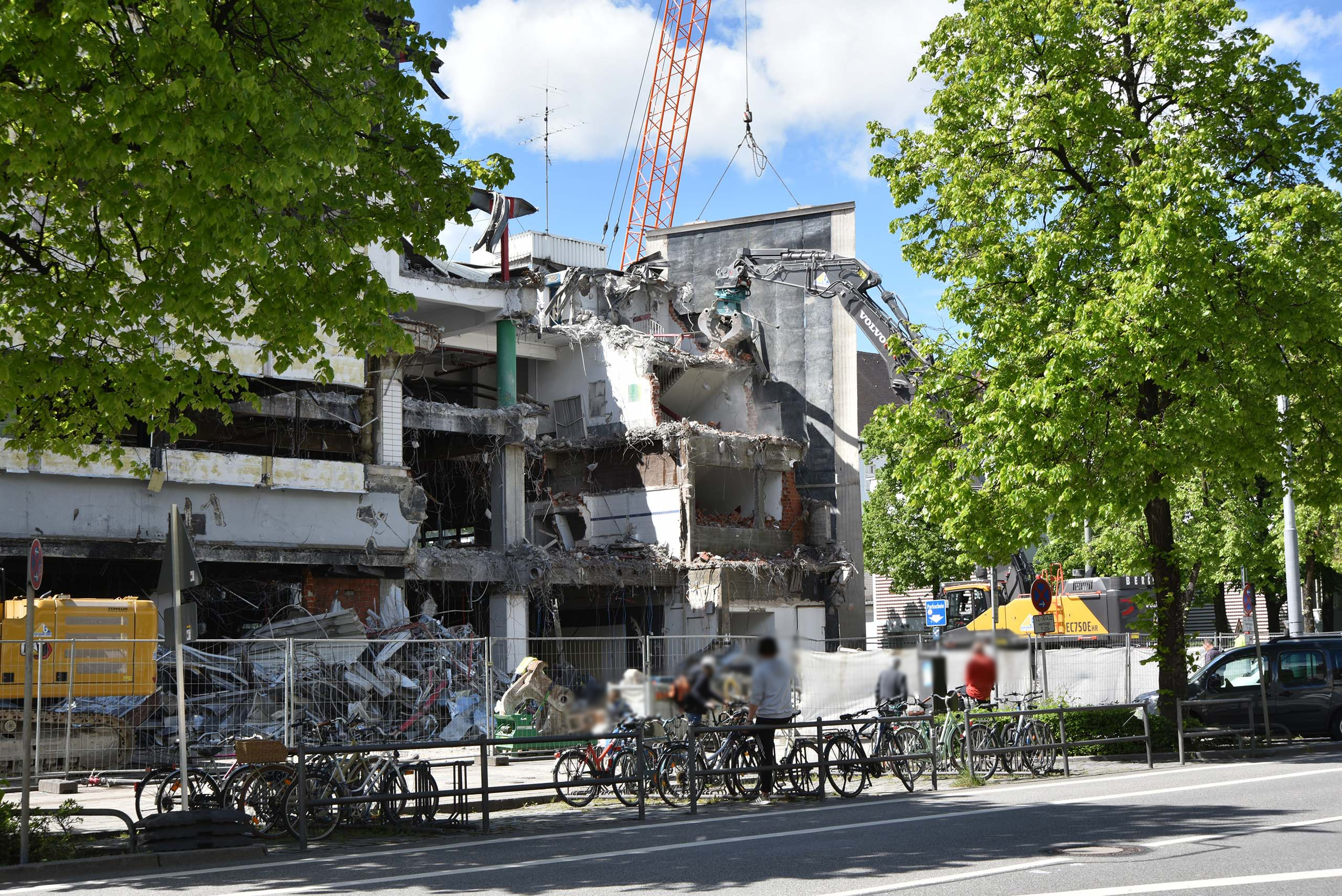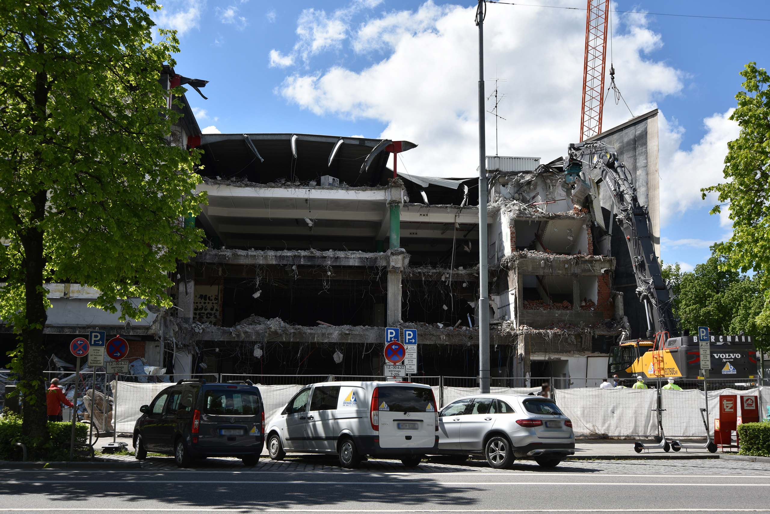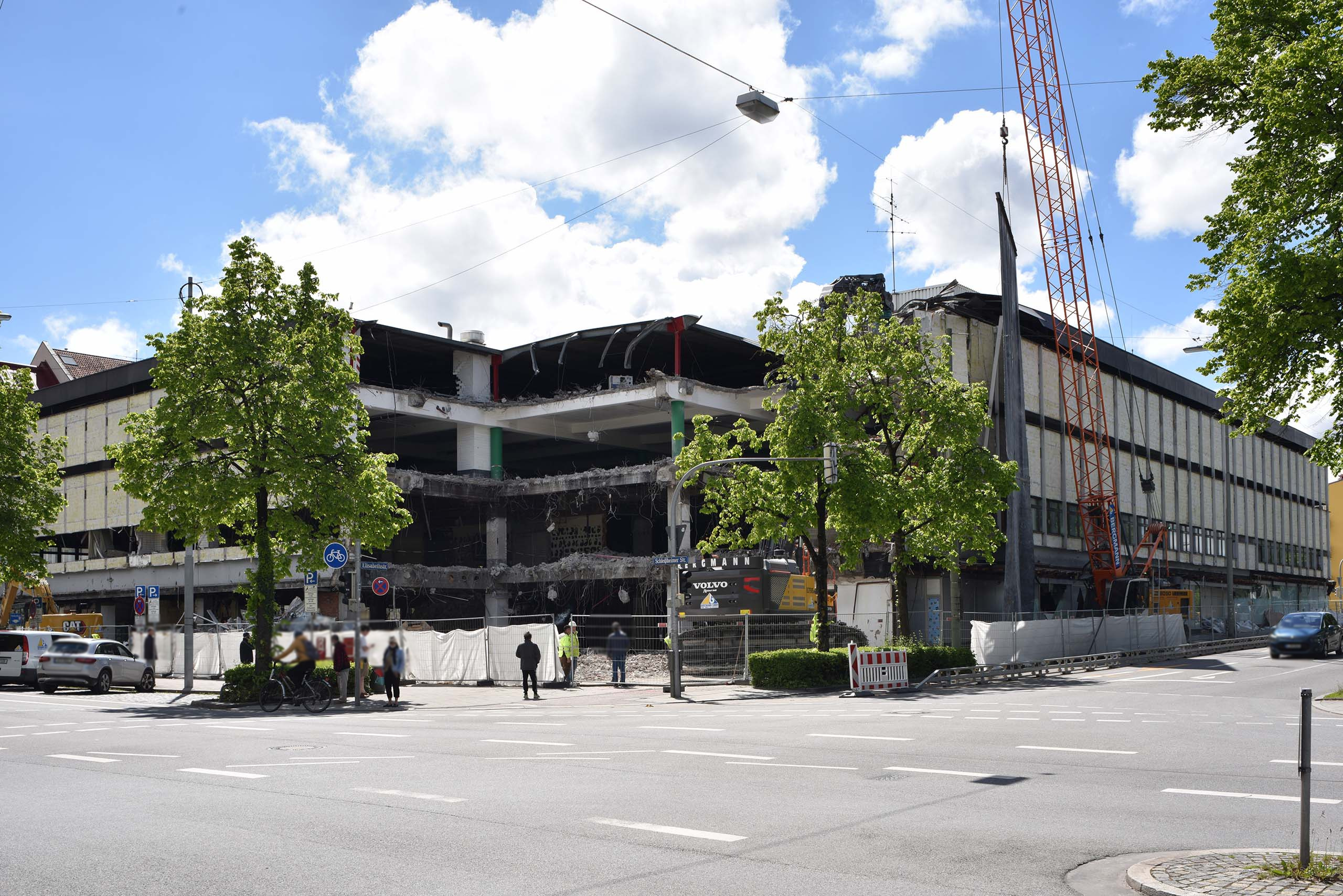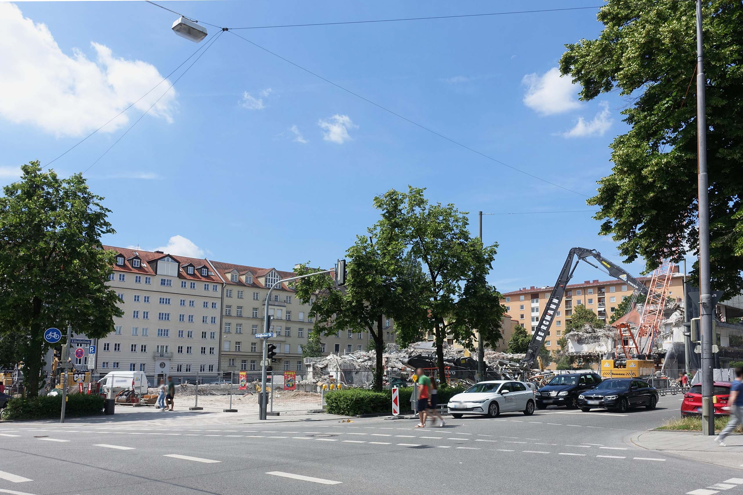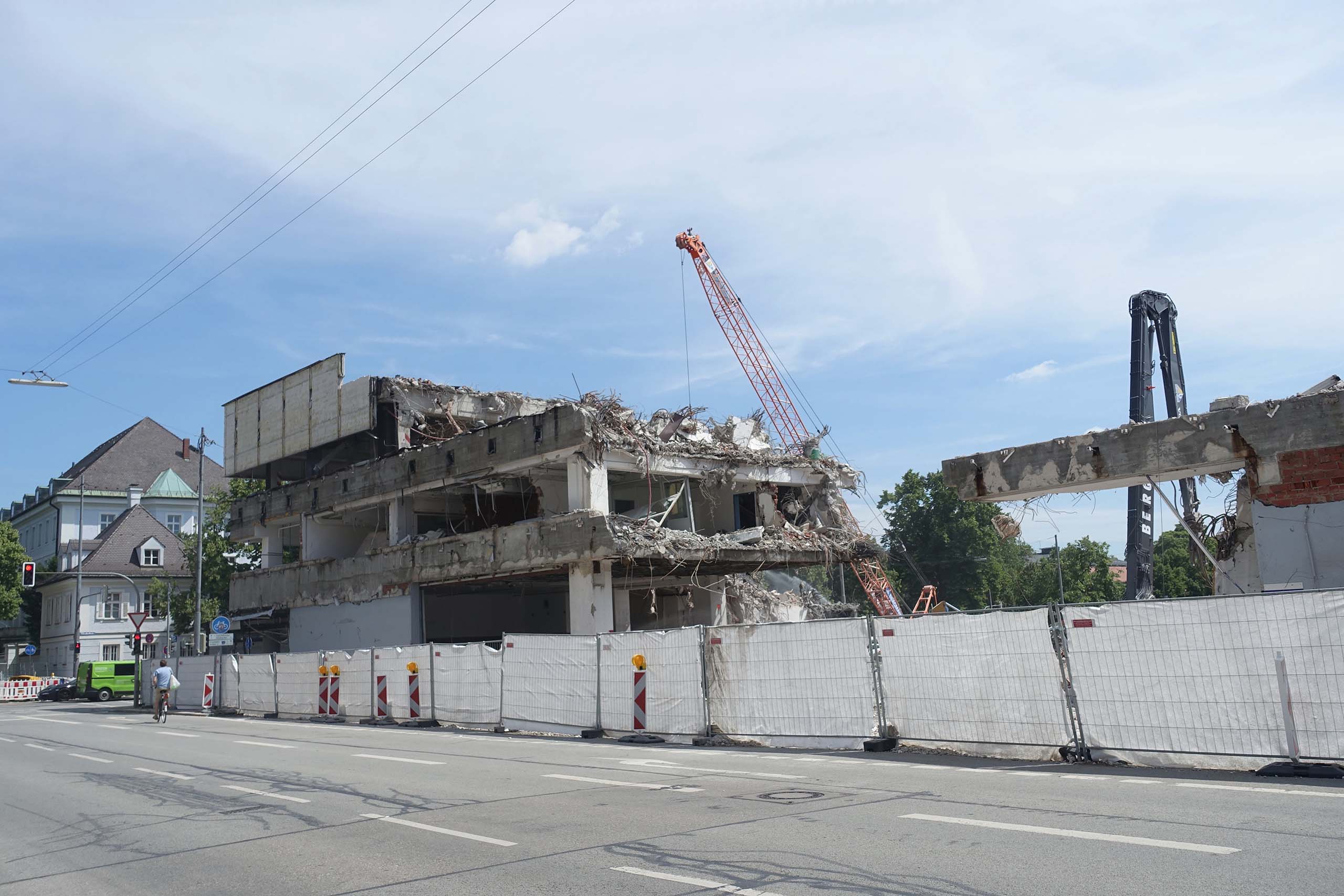 Der Abriss. Ab 8.2.2021 begann der Abriss. Die Aristo Grundbesitz GmbH & Co. 8. Beteiligungs KG hatte die Münchner Firma Bergmann beauftragt. Geplant sind ein Supermarkt mit 2500 qm und Büros für 1000 Arbeitsplätze. Die Pläne stammten zunächst vom Architekturbüro Oliv GmbH Thomas Sutor. Später wurde ein Architektenwettbewerb ausgeschrieben. Die Bauvoranfrage lag seit Längerem bei der LBK. Der BA 4 Schwabing-West hat die Pläne abgelehnt und präferierte nach wie vor Wohnungen statt Büros.3