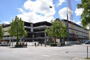 Der Neubau auf den 6200 qm ist mit sechs Stockwerken doppelt so hoch und wird 30.000 qm Büro- und Gewerbeflächen haben, dazu eine Tiefgarage mit drei Geschossen und rund 370 Stellplätzen plus einen Markt mit 2500 qm und einer Kita. Baubeginn war im Herbst 2021, bezugsfertig ist der Neubau 2024. Wohnungen sind nicht vorgesehen: Dies bemängelt der BA sowie das erhöhte Verkehrsaufkommen.1