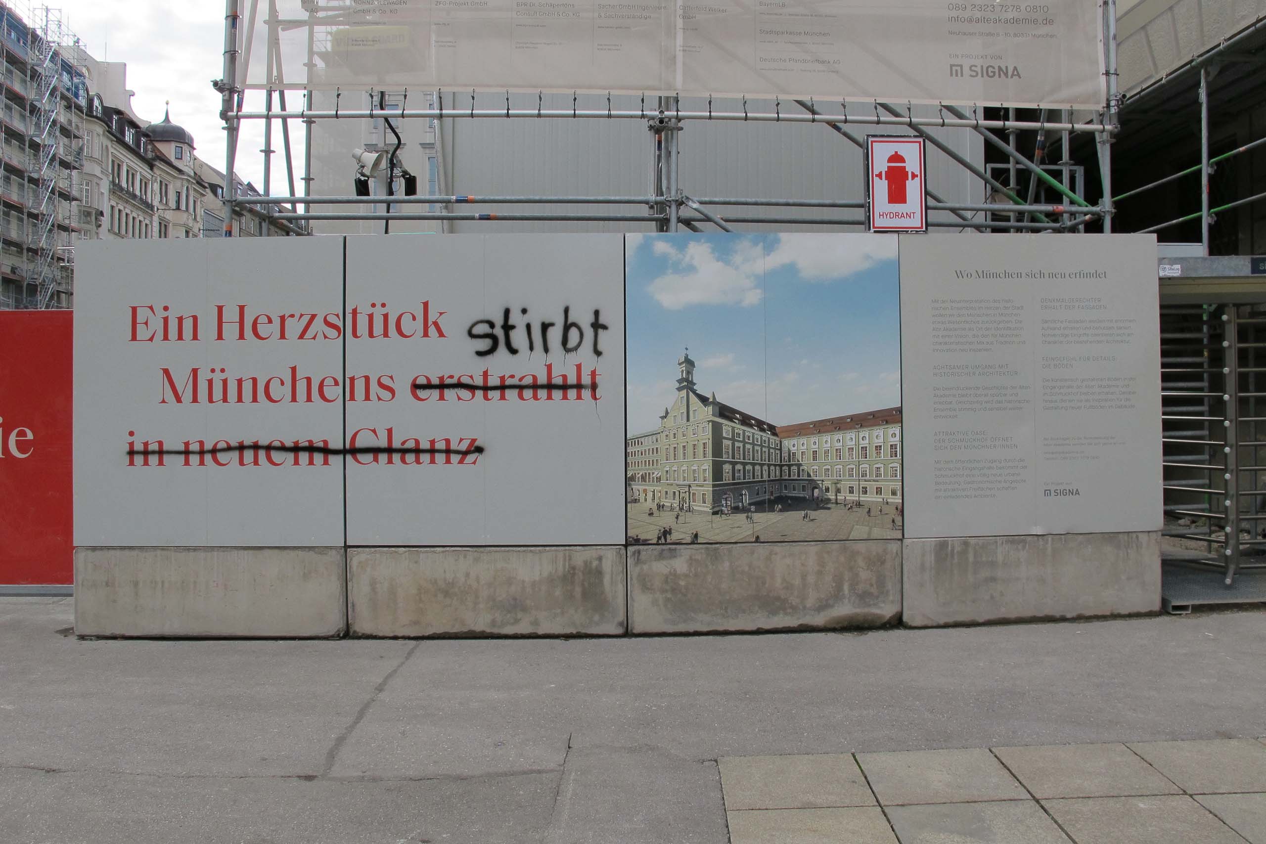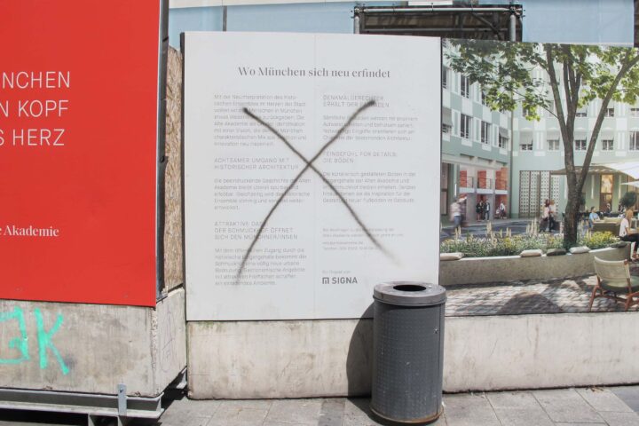 Seit zwei Jahren berichten Der Spiegel und andere Medien kritisch über das undurchsichtige Firmengeflecht von René Benko und seiner Signa Holding. Betroffen sind Deutschlands größte Städte: Berlin, Hamburg, Düsseldorf, Frankfurt, Stuttgart – und München. Dessen Oberbürgermeister Dieter Reiter (SPD) äußerte zu Benkos Münchner Investitionen in der Altstadt im Februar 2021: „Ihm gehört die halbe Innenstadt, und wir können es nicht aufhalten.“1 À propos: Seit Oktober 2023 ist endgültig klar, dass Benko und Signa so gut wie am Ende sind. Mitte November 2023 hat Signa der ausführenden Firma Porr Deutschland mitgeteilt, sie solle die Arbeiten an der Alten Akademie einstellen. Ebenso wurden die Arbeiten am Elbtower in Hamburg und am Hermannsplatz in Berlin. Am 24.11.2023 ging der Zusammenbruch der Signa-Gruppe weiter: Die erste der über 1000 Firmen, die Signa-Tochter Signa Real Estate Management Germany, stellte beim Amtsgericht Charlottenburg den offiziellen Antrag auf Konkurs wegen Zahlungsunfähigkeit. Signa warb für diese Tochtergesellschaft mit „Verlässlichkeit, Fairness und Termintreue“; diese Werte sind „in der Firmenphilosophie des von René Benko gegründeten Unternehmens verankert“.2.