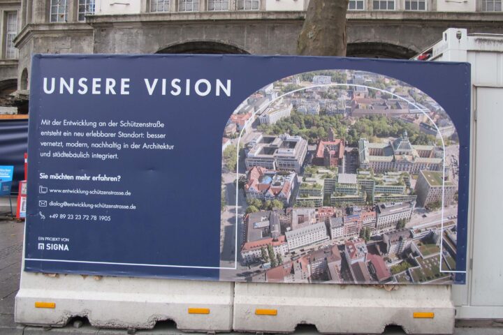 Die derzeitigen Signa-Bauruinen vom Hauptbahnhof (ehemaliges Hertie-Kaufhaus, Anbauten an der Schützenstraße – Projekt „Corbinian“) über den Stachus (Kaufhaus Oberpollinger) über die Fußgängerzone (Alte Akademie) bis zum Marienplatz (Galeria Kaufhof, Kaut-Bullinger-Haus), dazu das Galeria-Haus am Rotkreuzplatz (steht zum Verkauf) werden noch sehr lange das Stadtbild Münchens prägen. Und bis vor kurzem hörte man dazu vom Münchner OB Reiter: NICHTS. (Er strebt ja nach bislang eher bescheidenen neun Jahren im Amt 2026 eine dritte Amtszeit an: von 2026 bis 2032.). Erst anlässlich des Baustopps an der Alten Akademie hat er nun das Planungsreferat gebeten, alle Anträge der Signa-Gruppe zu stoppen, beispielsweise keine Abbruchgenehmigungen zu erteilen. Reiter hofft nun, dass Signa „vernünftige Investoren“ findet, die eine „nachhaltige und verantwortungsvolle Stadtentwicklung“ verfolgen und nicht „den schnellen Gewinn“.3