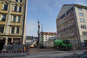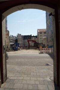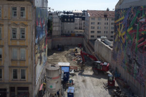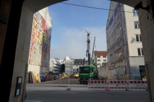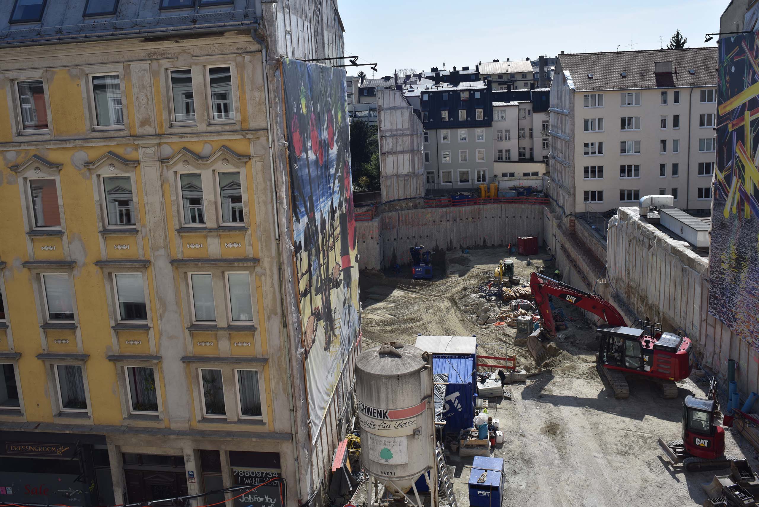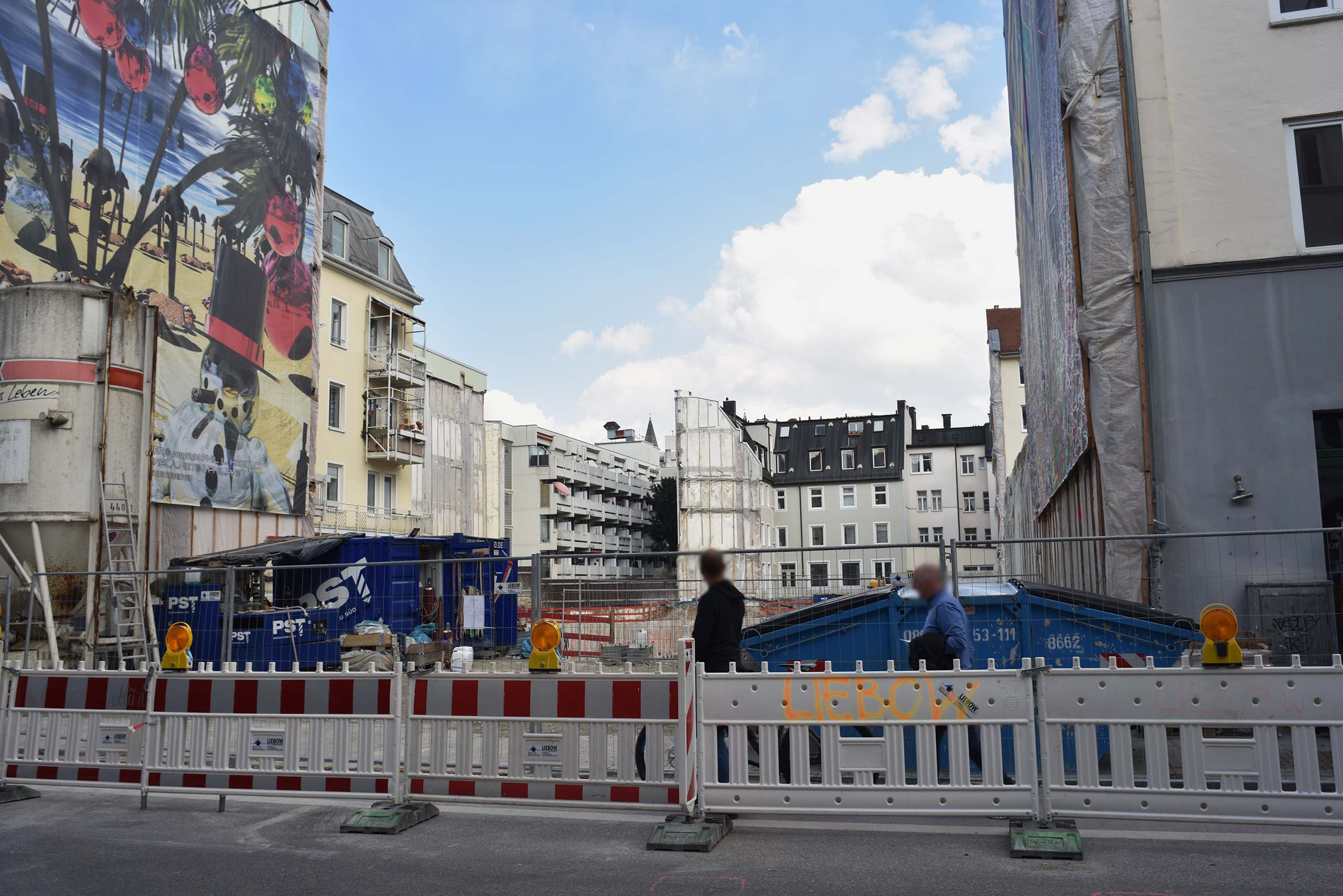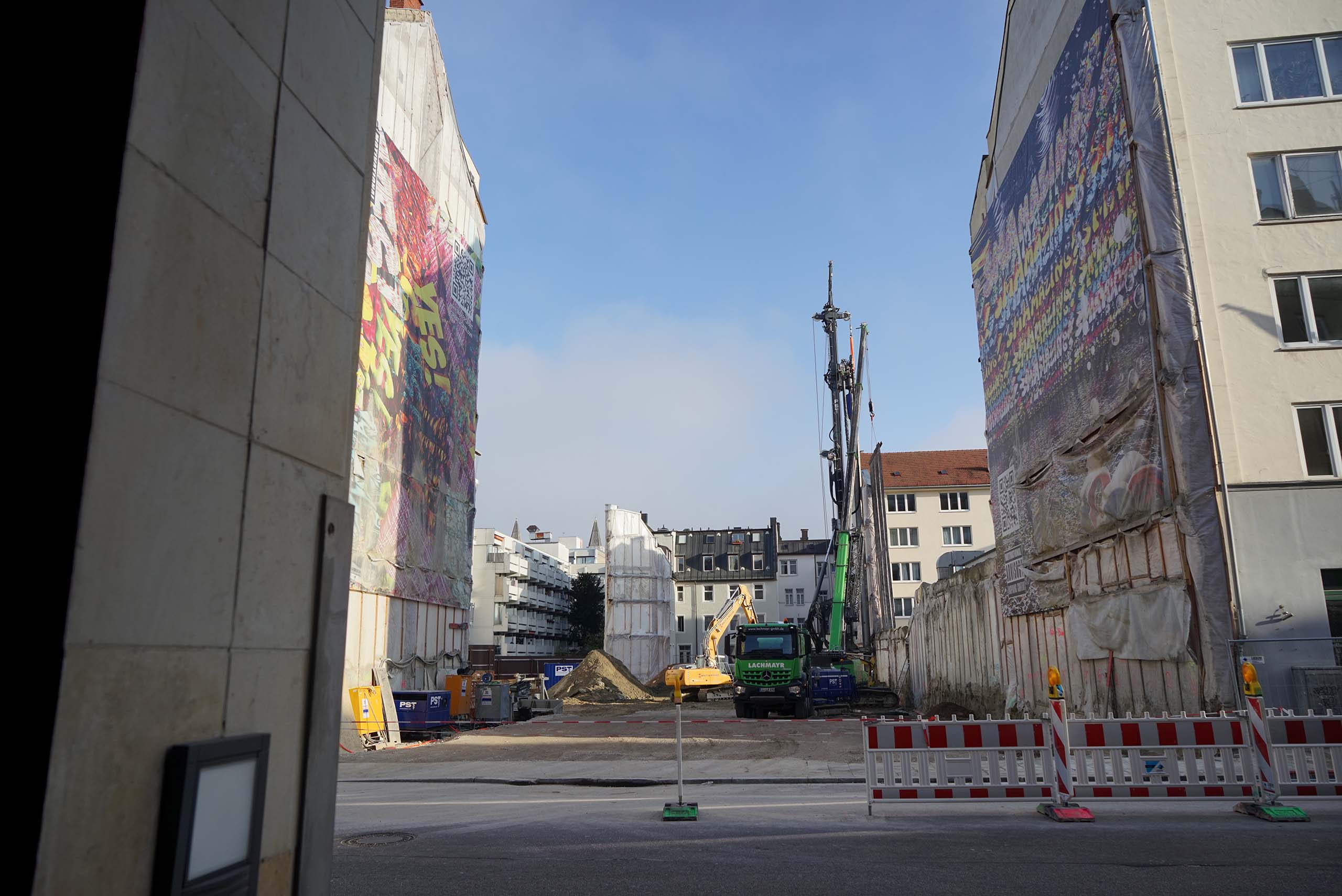 Areal Türkenstraße 52: Erster Bauantrag für Abbruch und Neubau 2012, zweiter Bauantrag 2017, 2019 dritter Bauantrag mit neuem Eigentümer, Abriss 2019, Baugrube.